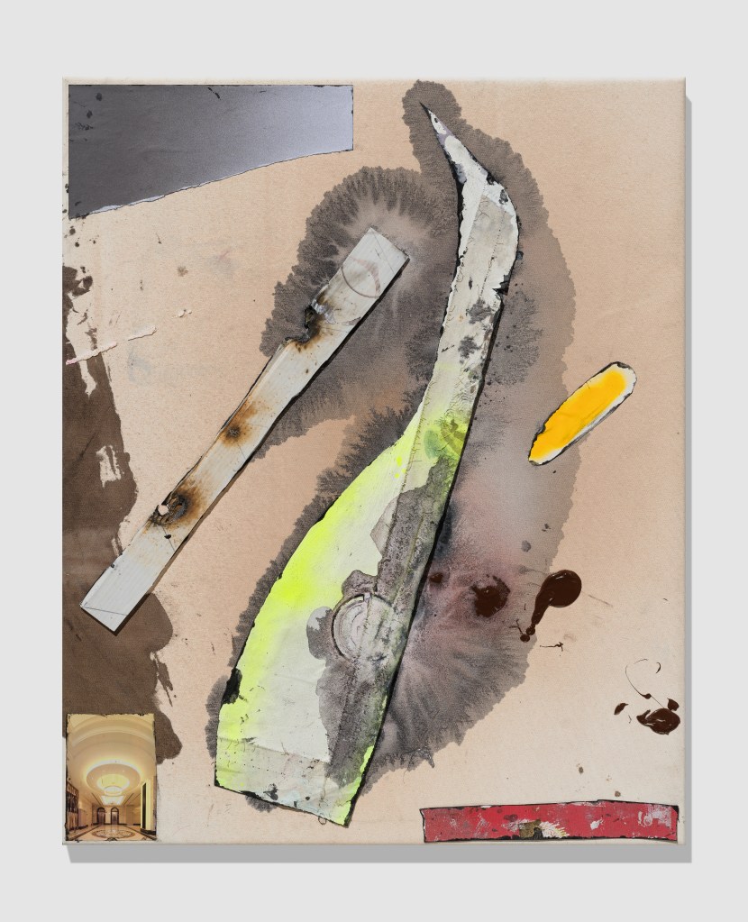Hornet Grebe,Sora, 2020, 140×125, acrylic, paper, burned plastic and housing ad on canvas